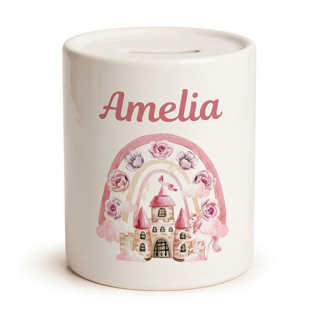 The enchanting design features a graceful unicorn set before a whimsical castle, capturing the wonder of childhood dreams. Carefully illustrated with delicate pastel tones, the money bank not only stirs imagination but also blends effortlessly with a girl's bedroom or nursery décor. Your child's name is added seamlessly into the artwork, turning the piece into a treasured keepsake that they will cherish for years to come.