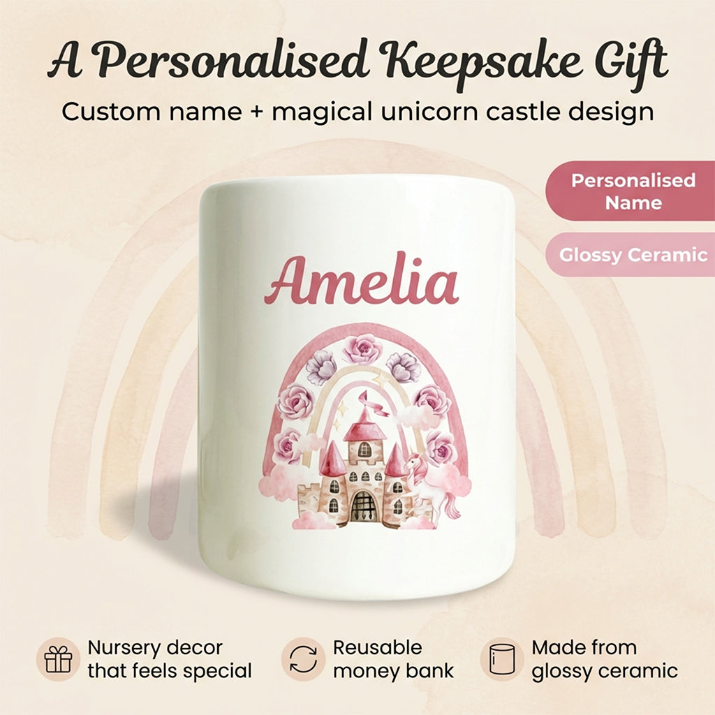 Personalised Money Bank Girls Unicorn Castle, Kids Money Box Customised Gift Baby Child Birthday