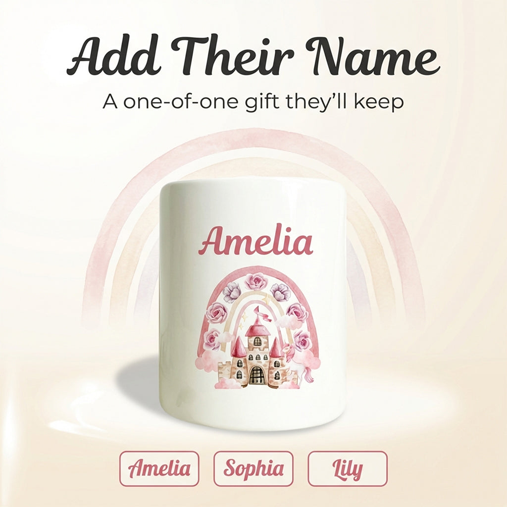 🏰 Personal Touch Made Easy – Easily personalise this piggy bank with any name to ensure your gift is one-of-a-kind. Our quick turnaround and professional printing ensure your customised gift arrives perfect every time, ready to inspire smiles.
